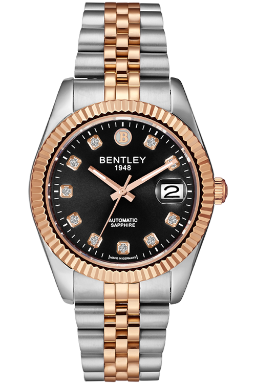 Rose gold two-tone SS 41×49 mm, Ø31 mm black dial w/ 10 white sapphires, sapphire glass, 6 mm crown, NH35 Automatic.