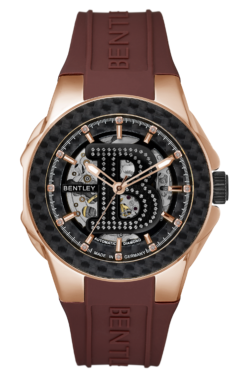 Rose-gold tone 43×54 mm, black carbon bezel, Ø33 mm black dial w/ 12 diamonds & B-logo (91 white sapphires), brown rubber, sapphire, 7.5 mm crown, 8N24 auto