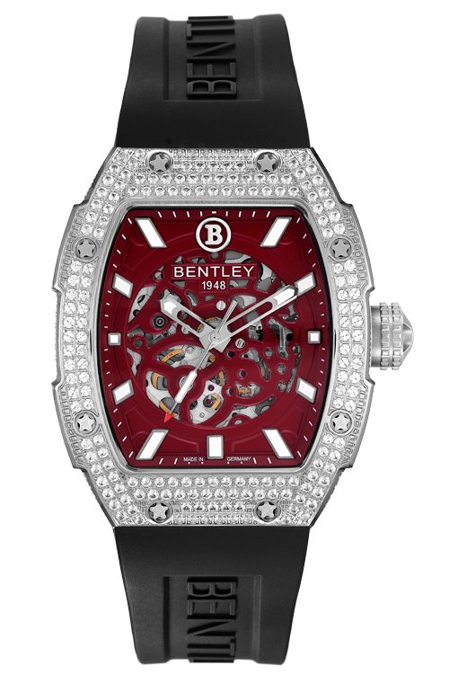 Stainless steel 39×47 mm, Ø29.7 mm dark-red dial, 304 white sapphires, black rubber strap, sapphire, 9 mm crown, 8N24 automatic